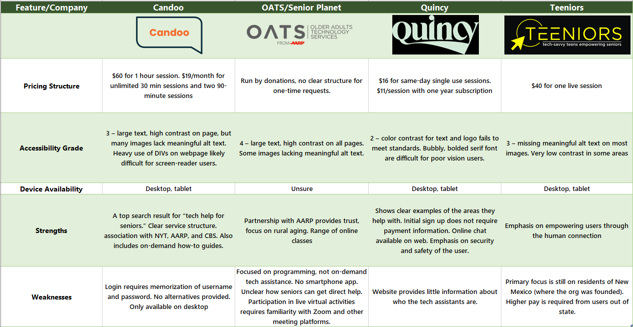 To understand our competitive landscape, I assessed one of four existing solutions (Candoo) targeting older adults. While there were quality options already on the market, we noticed some potential issues or gaps from our competitors: