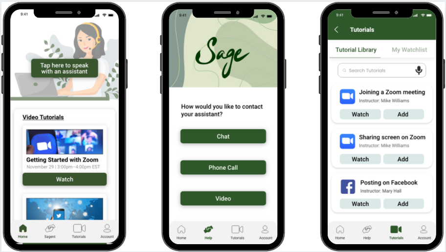 Sage is a smartphone app designed for seniors to gain 1-on-1 technical support for social media and video conferencing apps from a trained assistant. Users can: