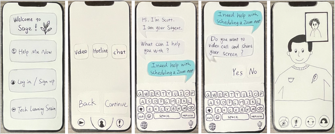 After reviewing each team member’s sketches, we opted to continue with the concept of virtual tech support for older adults. We found notable flaws in the execution of our other options and found this concept to be the most impactful: